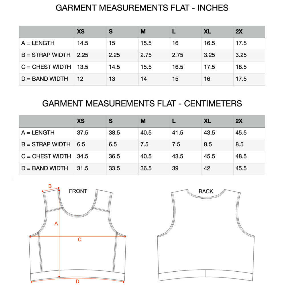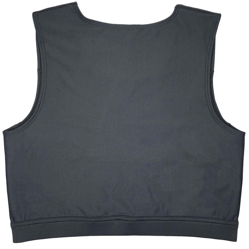 The front panel is designed with multiple layers of firm stretch and non-stretch fabric to flatten the chest while allowing the garment to curve around the body. The back panels are medium strength stretch fabric allowing for ease of movement and breathing.